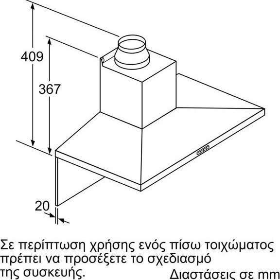 Ο απορροφητήρας της εταιρείας Bosch, ενεργειακής κλάσης A, τοποθετείται στον τοίχο. Είναι σχεδιασμένος με ένα διακοσμητικό που καλύπτει τη σωλήνα εξαγωγής αέρα και μοιάζει με καμινάδα.