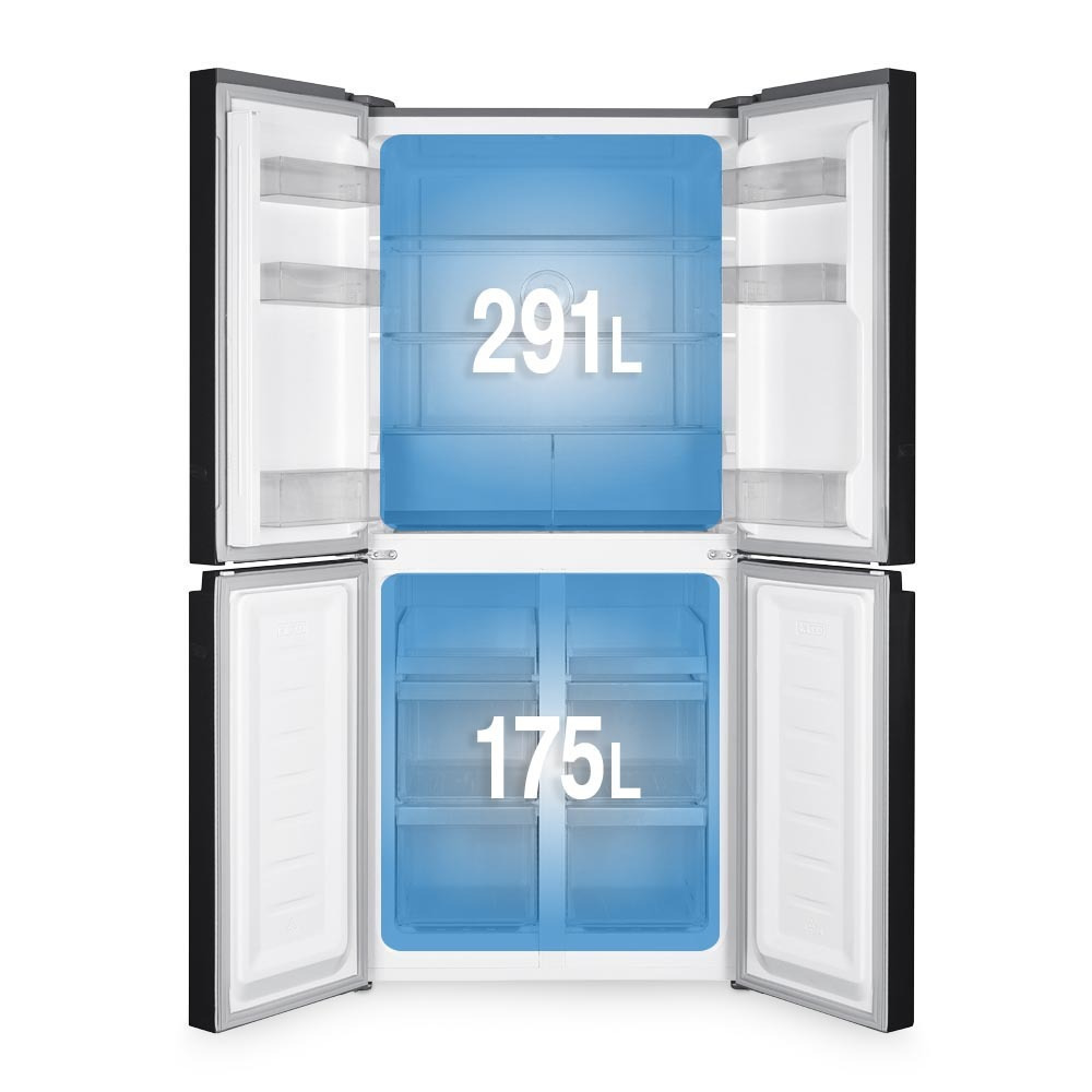 Με συνολικό όγκο 466 λίτρων, το ψυγείο σου δίνει όλον τον χώρο που χρειάζεσαι. Ο χώρος του ψυγείου είναι 291L, με τρία γυάλινα ράφια, δύο συρτάρια και έξι ράφια πόρτας, ώστε να οργανώνεις εύκολα τα καθημερινά σου τρόφιμα. Η κατάψυξη, με χωρητικότητα 175L, περιλαμβάνει τέσσερα συρτάρια και δύο ράφια, ώστε να αποθηκεύεις κατεψυγμένα προϊόντα με απόλυτη τάξη. Είτε πρόκειται για οικογενειακές αγορές είτε για προμήθειες εβδομάδας, αυτό το ψυγείο σε καλύπτει πλήρως.